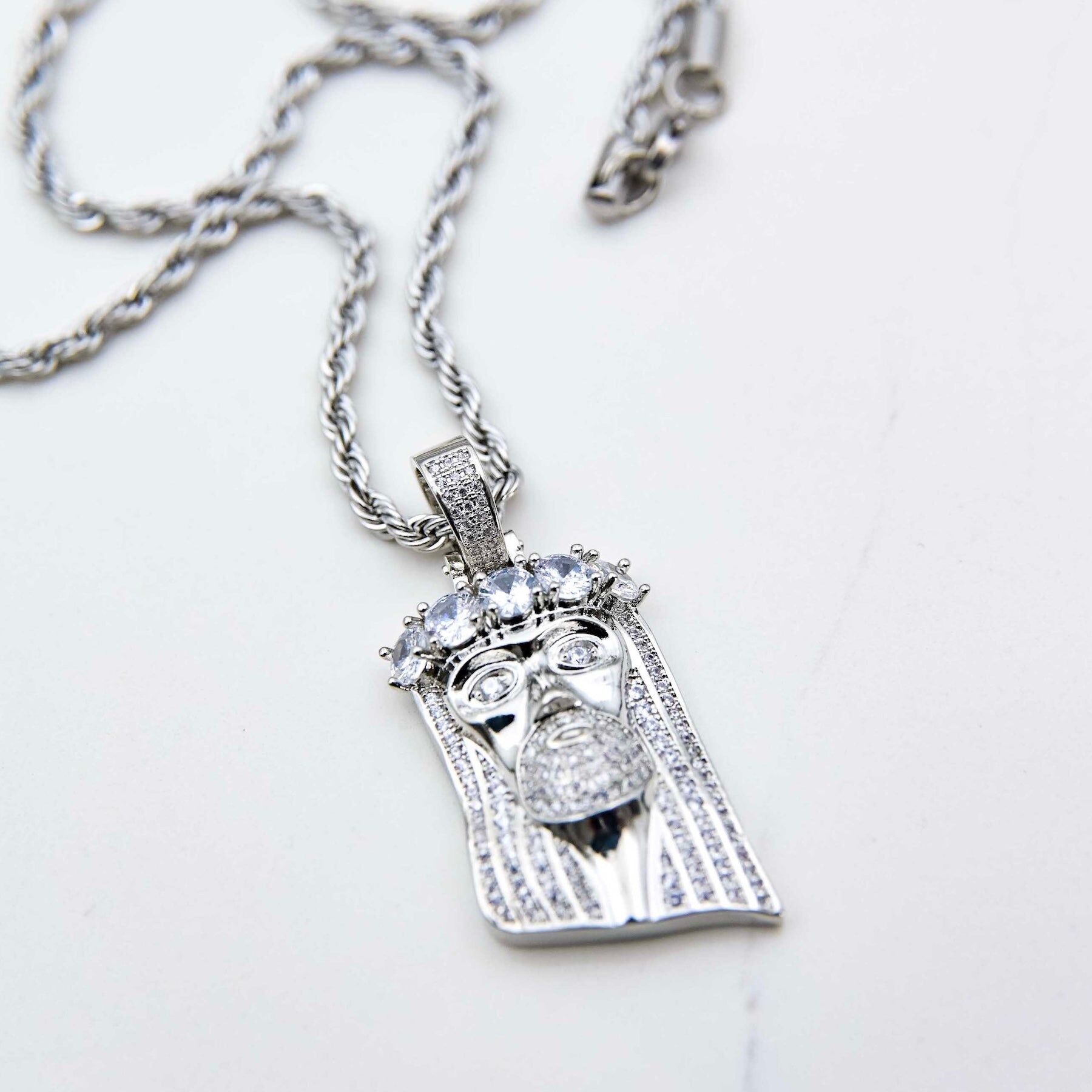 Introducing the Luminary Jesus Piece, the ultimate flex for any hip-hop boss who's got taste. Whether you choose Gold or Silver, this pendant is all about that divine drip with the face of Jesus meticulously set with handset stones that grab everyone's attention.